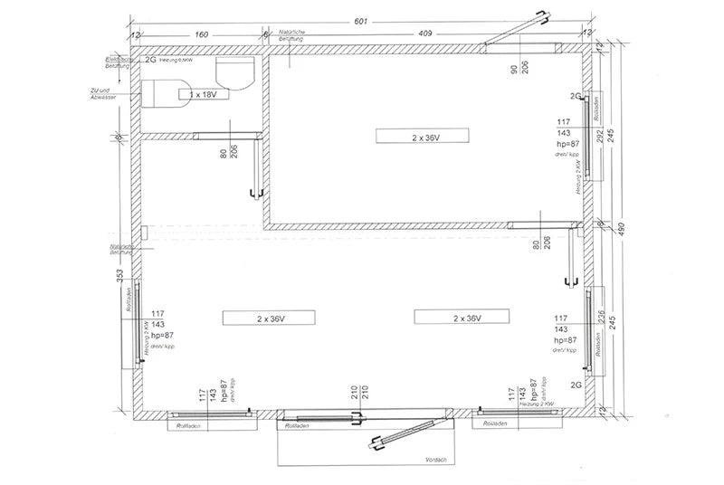 Tôle galvanisée lisse 0,5 mm à l’extérieur. Pente de toit 2 %. Isolation avec laine minérale pressée 100 mm