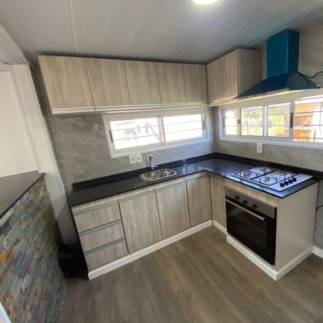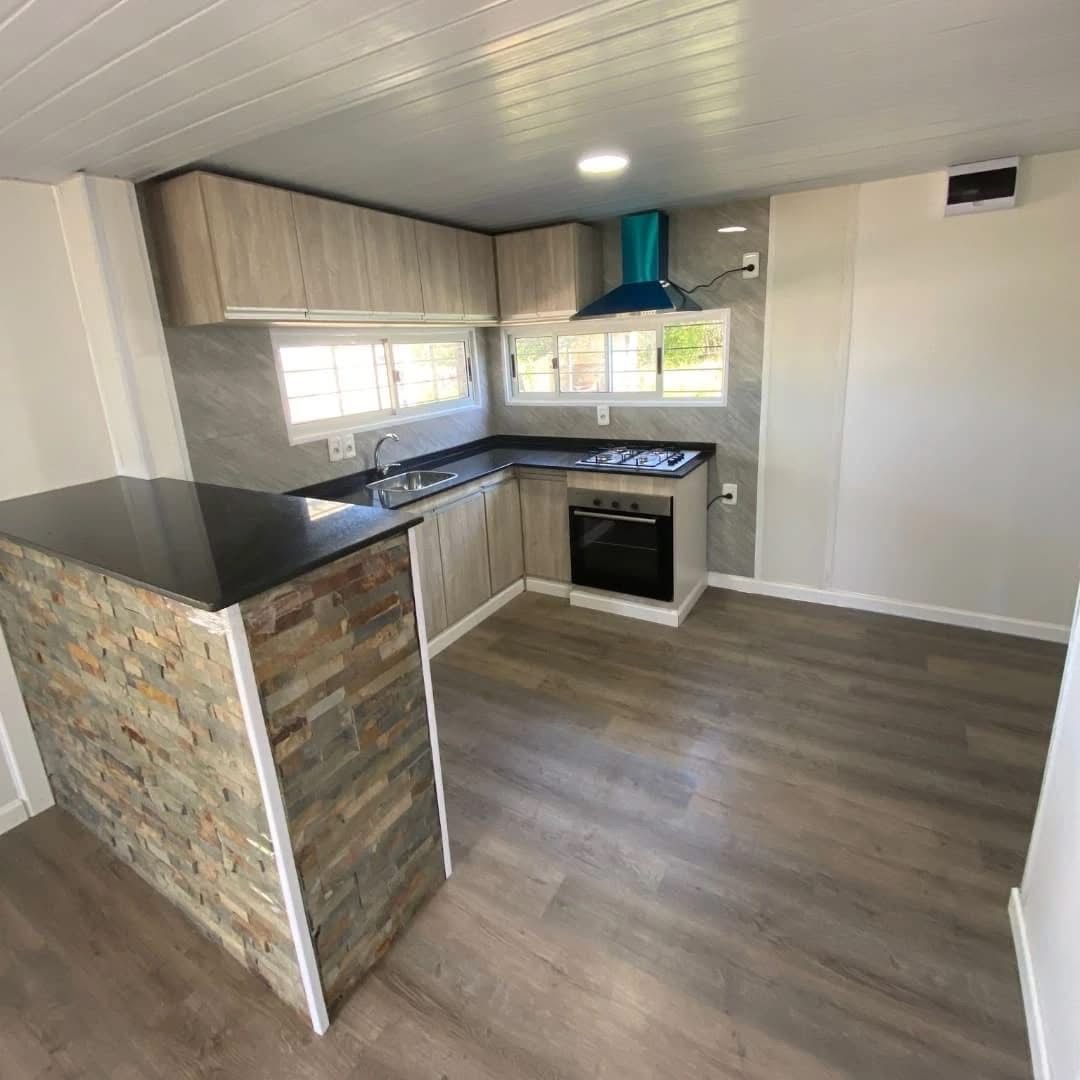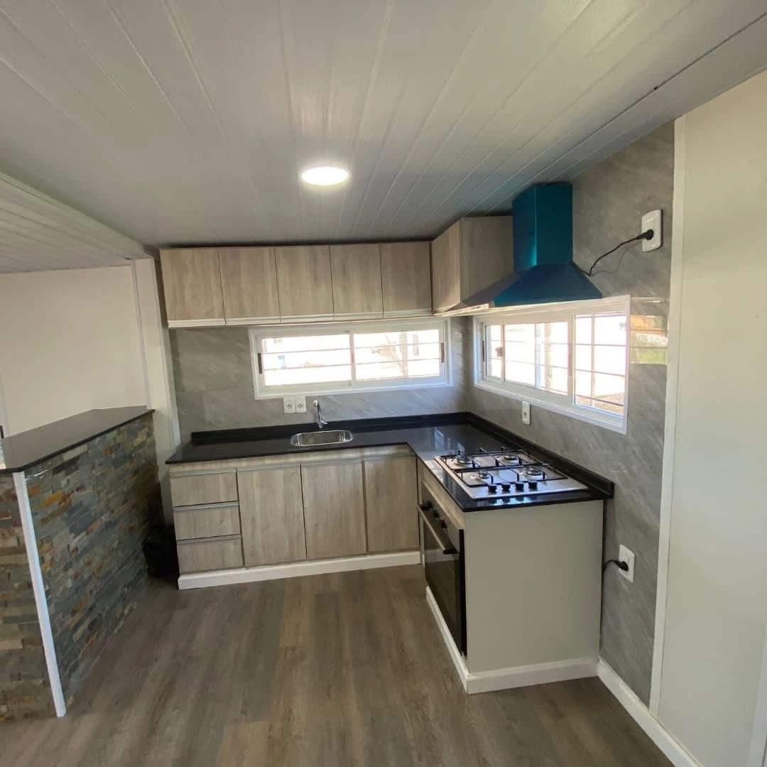 El interior incluye revestimientos en melamínico, cielorraso de PVC y aislamiento térmico y acústico mediante lana de vidrio aluminizada de 50 mm. La unidad dispone de instalación eléctrica completa, aberturas de aluminio color blanco y baño completamente revestido en cerámica. El área de cocina también cuenta con revestimiento cerámico.